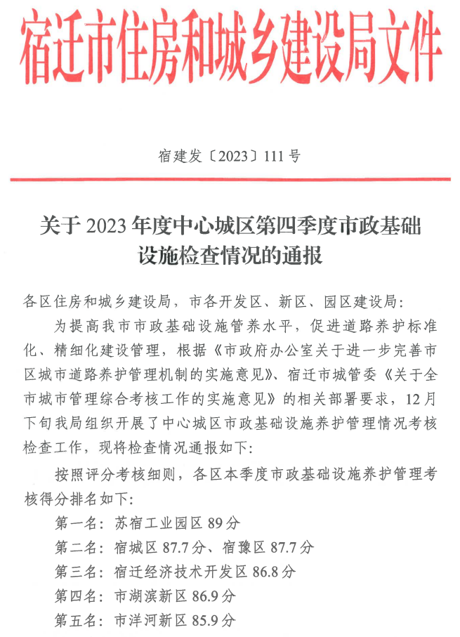 近日,宿遷市住房和城鄉(xiāng)建設(shè)局通報(bào)2023年中心城區(qū)第四季度市政基礎(chǔ)設(shè)施考核檢查情況,園區(qū)以89分的成績喜獲全市第一名。