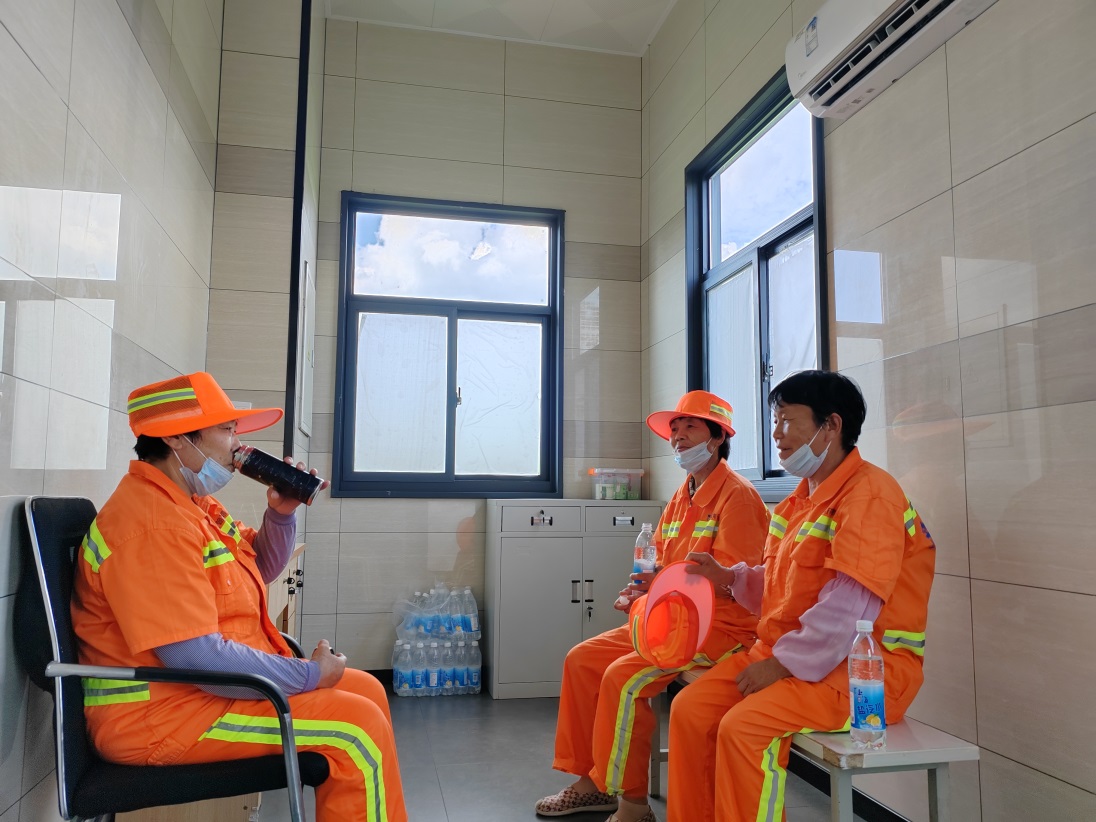 “清涼驛站”全開放,避暑納涼有去處。配有空調、防暑降溫藥品、飲用水的31座公共廁所的休息室、管理間全部對外開放,工人作業(yè)間歇,可以隨時到“驛站”避暑納涼,讓一線工人在酷暑中享受一絲清涼。