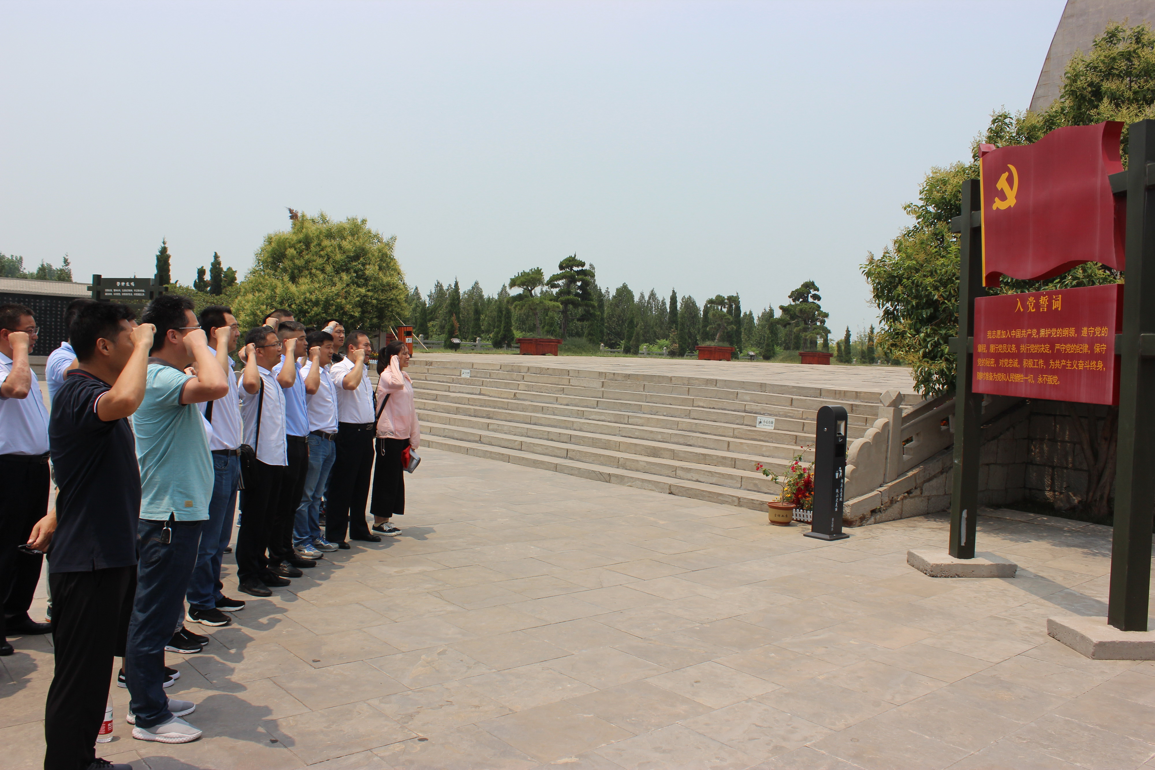 在鐵道游擊隊紀念碑前,黨員們面對鮮紅的黨旗,莊嚴的舉起右手,重溫入黨誓詞。“我志愿加入中國共產(chǎn)黨,擁護黨的綱領,遵守黨的章程,履行黨員義務……隨時準備為黨和人民犧牲一切,永不叛黨。”一聲聲鏗鏘有力的誓言響徹微山湖鐵道游擊隊紀念園,表達了黨員們對黨的無限忠誠,對鐵道游擊隊英雄們的崇高敬意。
