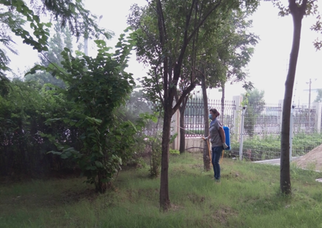 立秋以來天氣晴朗少雨,物業(yè)管理部按照園區(qū)公舍綠化養(yǎng)護計劃積極開展病蟲害防治工作,組織養(yǎng)護人員在人員流動性較少的時間段對園區(qū)公舍的花灌木、球類、綠籬等噴灑氧化樂果、阿維高氯等園林農藥,共用30瓶農藥,有效控制了園區(qū)公舍綠化病蟲害的發(fā)生。